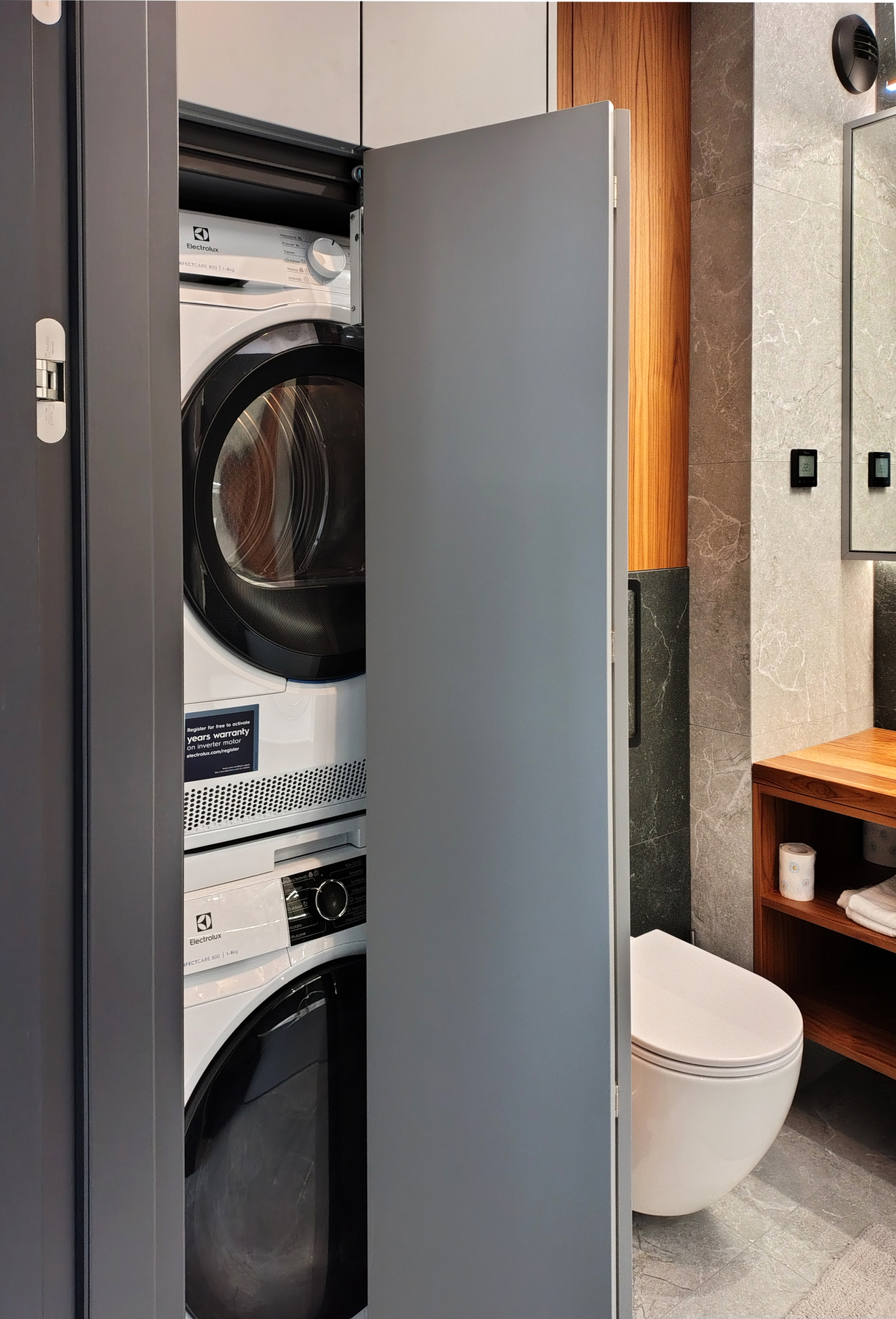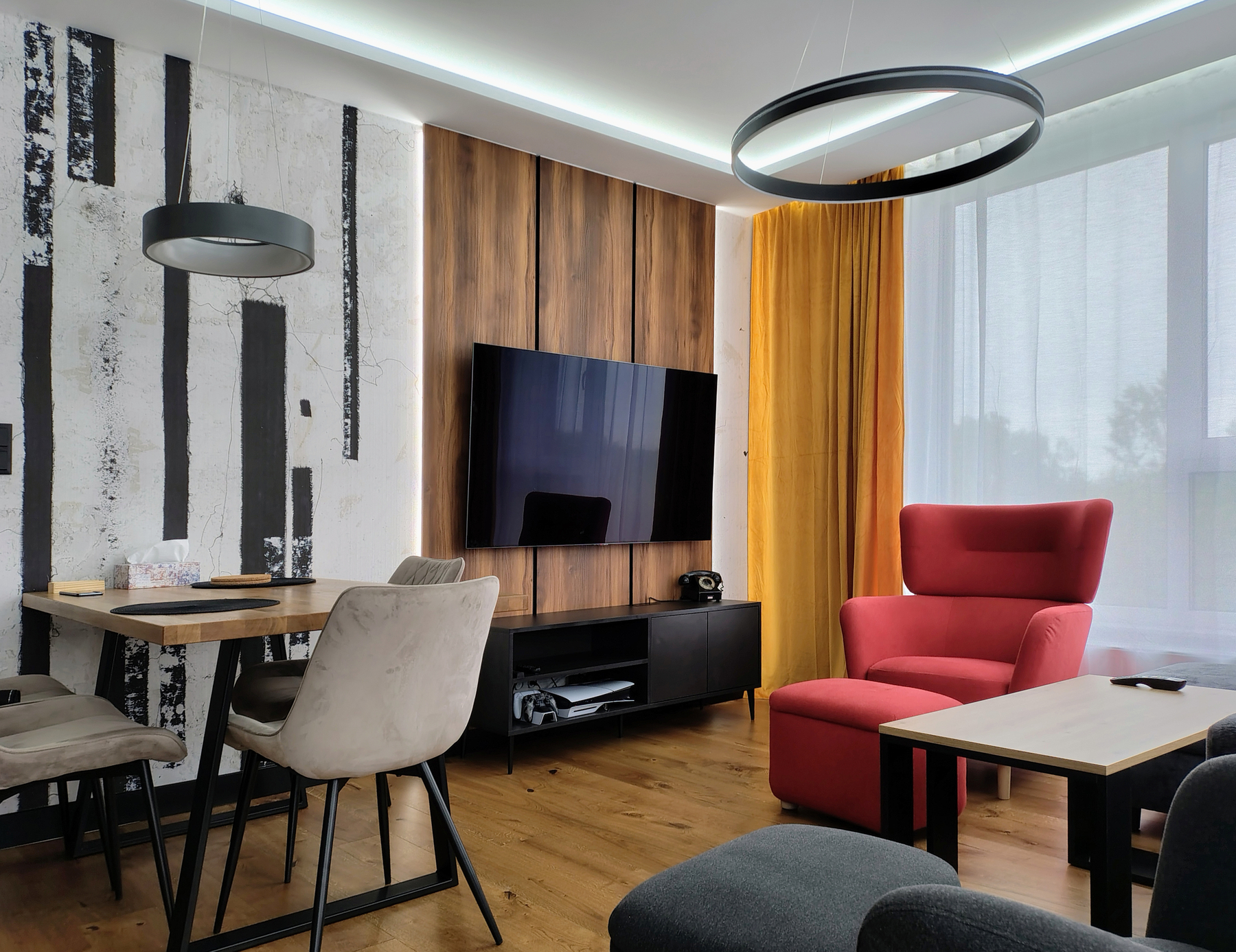 Nowoczesne mieszkanie dla rodziny. Do zaprojektowania były salon z aneksem kuchennym oraz dwie łazienki. Część mebli były do przeniesienia z poprzedniego mieszkania. W taki sposób połączyłyśmy nowy pomysł z ulubionymi elementami z przeszłości.
