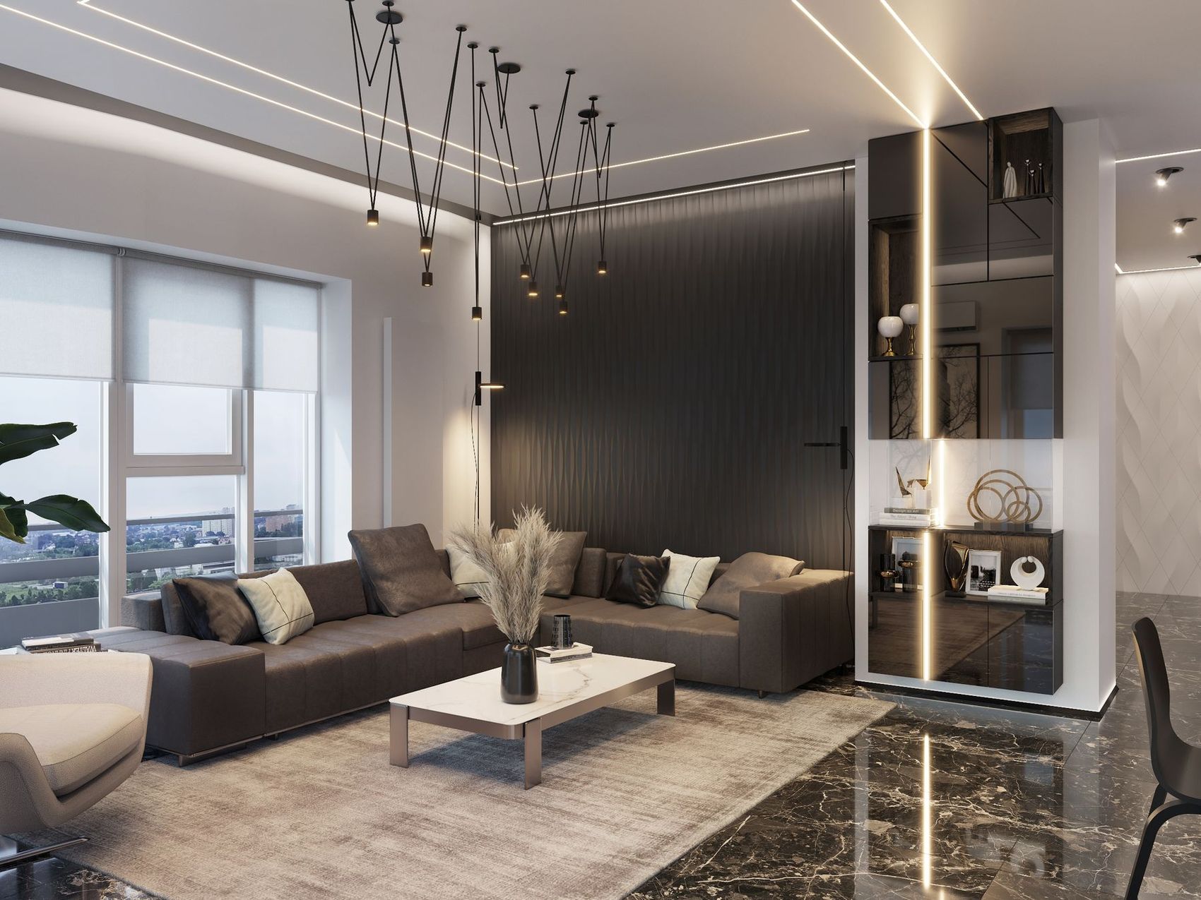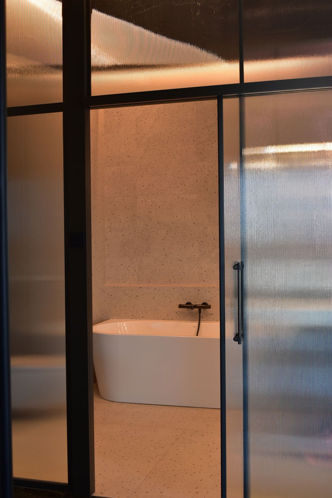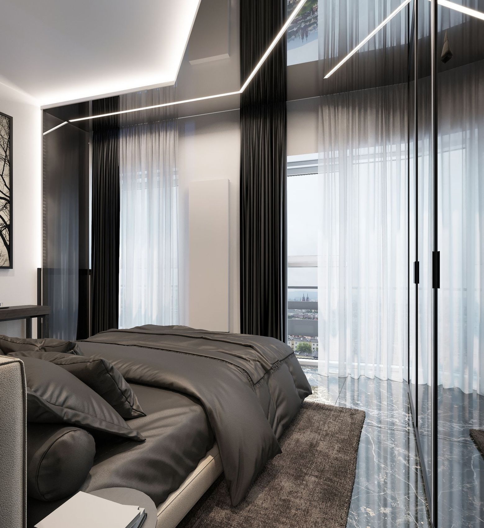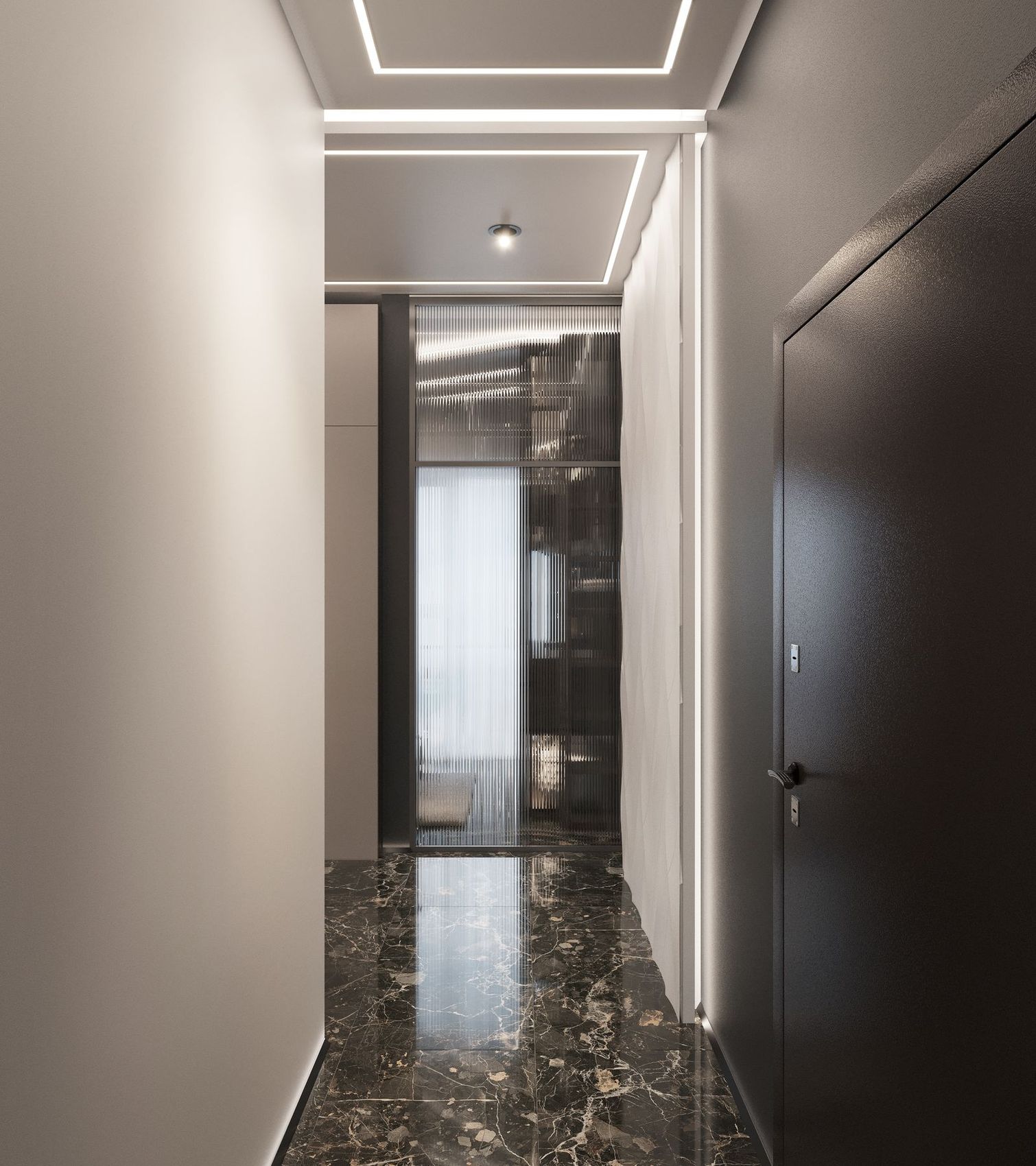 Mieszkanie zostało zaprojektowane w celu odzwierciedlenia indywidualnego charakteru klienta. Zastosowanie ciemnych kolorów oraz nietuzinkowych rozwiązań, takich jak szklane ściany w łazience, stalowe okładziny ścienne, szkło na suficie i oryginalny grzejnik, nadało wnętrzu niepowtarzalny styl. W trakcie procesu realizacji niektóre elementy uległy zmianie, zostały one maksymalnie dopasowane do pierwotnego projektu.