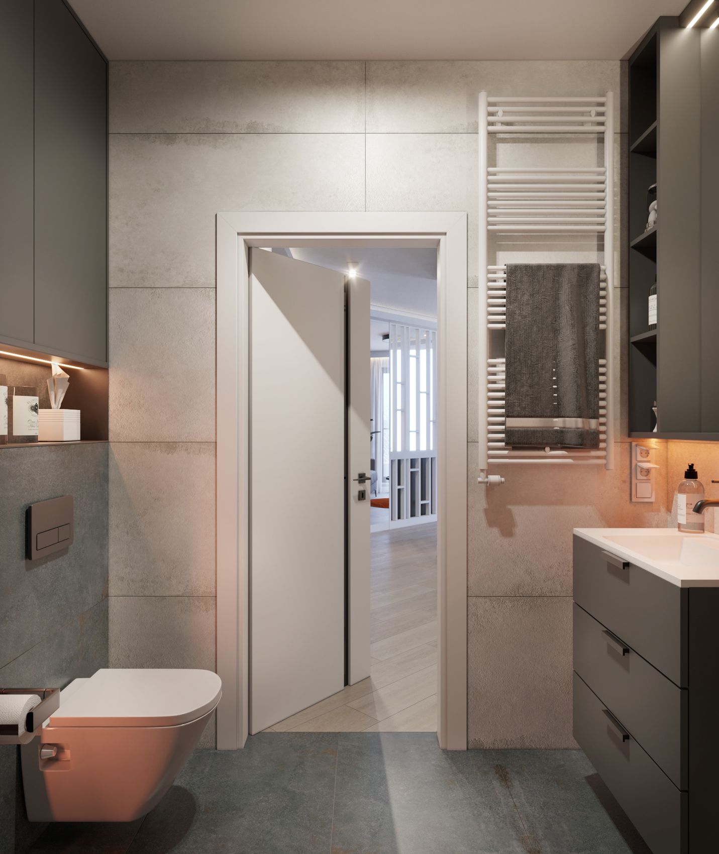 Projekt mieszkania pod wynajem był wykonywany z myślą o dobre zaaranżowanie przestrzeni oraz nietuzinkowych kolorach. Rzut tego mieszkania był wyzwaniem, ponieważ  łukowate ściany nie są proste do wykorzystania we wnętrzu, tak samo, jak nierównoległe ściany, które tworzyły dodatkowe trudności w procesie projektowym, Musiałyśmy  maksymalnie się dostosować do ścian i wziąć z tego rzutu maksimum. Kolory dodały wibrującej energii w to wnętrze. Kolorowe oświetlenie dodaje charakteru i jest dopasowywane do gustu wynajmującej osoby.
