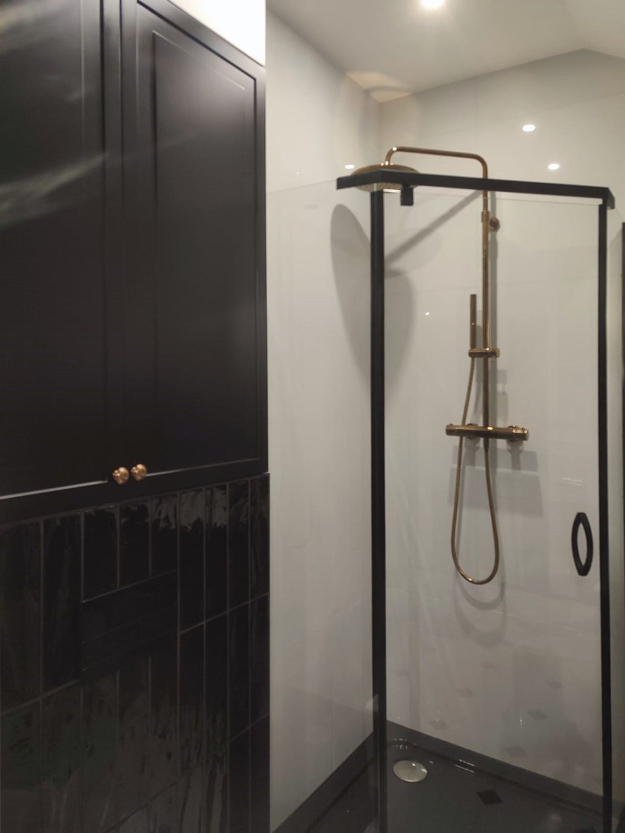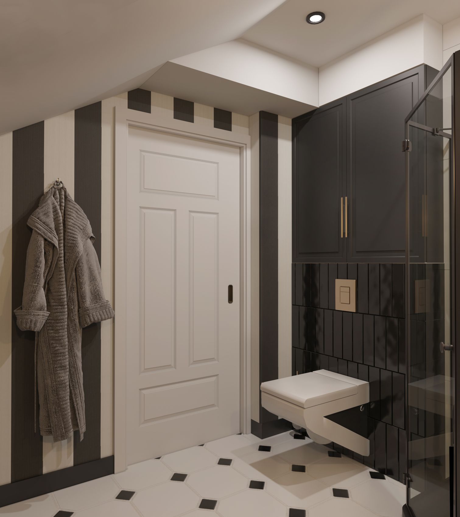 Projekt małej łazienki pod schodami został stworzony w oparciu o stylistykę oraz kolorystykę istniejącej już łazienki w tym domu. Czarno-białe wnętrza zawsze wyróżniają się i nadają oryginalny charakter pomieszczeniu, jednak nie każdy klient decyduje się na tak odważny design. Prezentuję wizualizacje oraz zdjęcia z realizacji projektu, aby pokazać możliwości aranżacyjne i efektywnie przekonać klientów do podobnych rozwiązań.