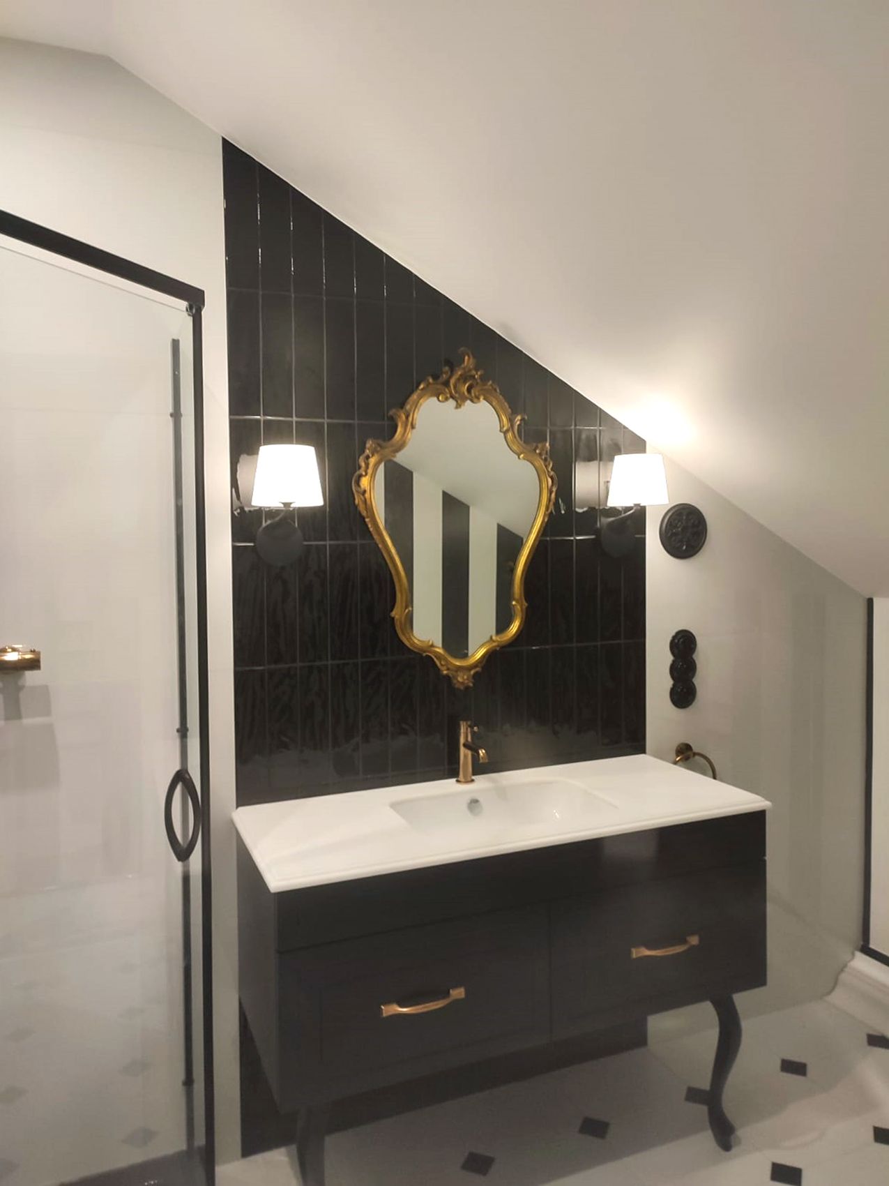 Projekt wnętrza małej łazienki pod schodami w domu jednorodzinnym w stylu glamour