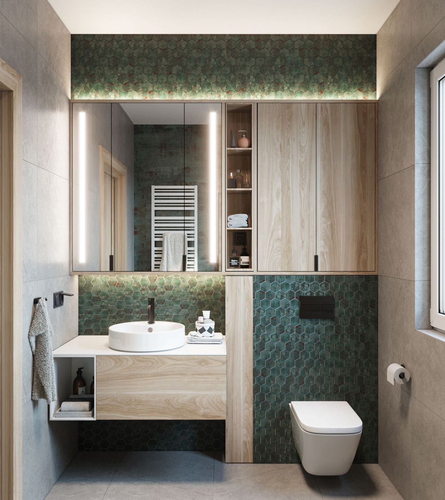 Projekt wybranych pomieszczeń w domu jednorodzinnym – salonu z kuchnią i dwóch łazienek w postaci wizualizacji na bazie dostarczonego układu funkcjonalnego