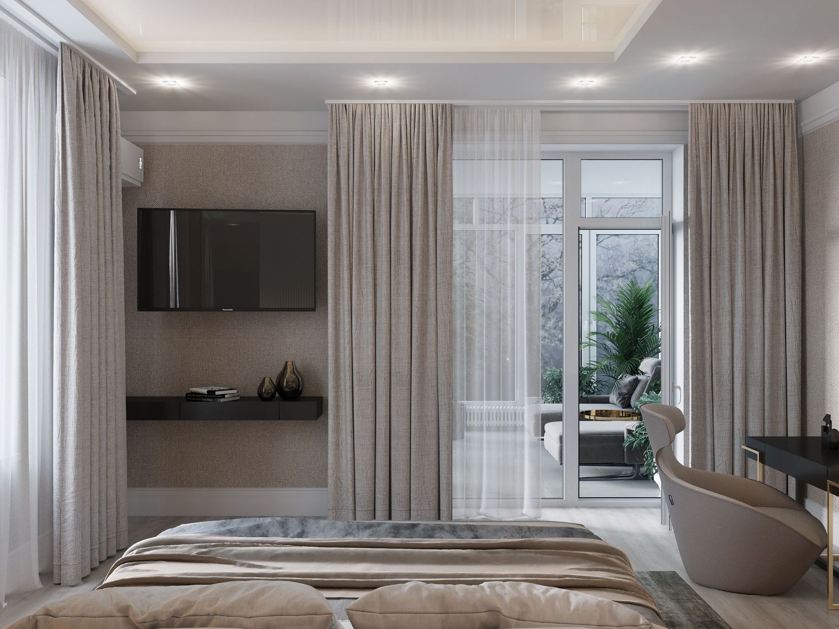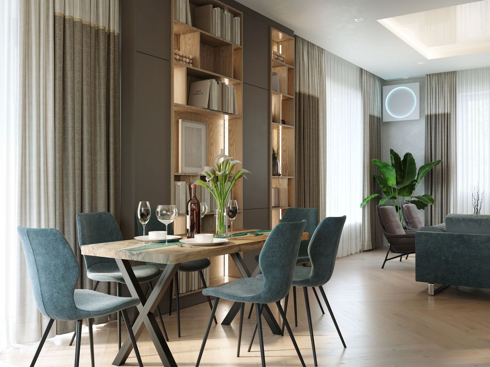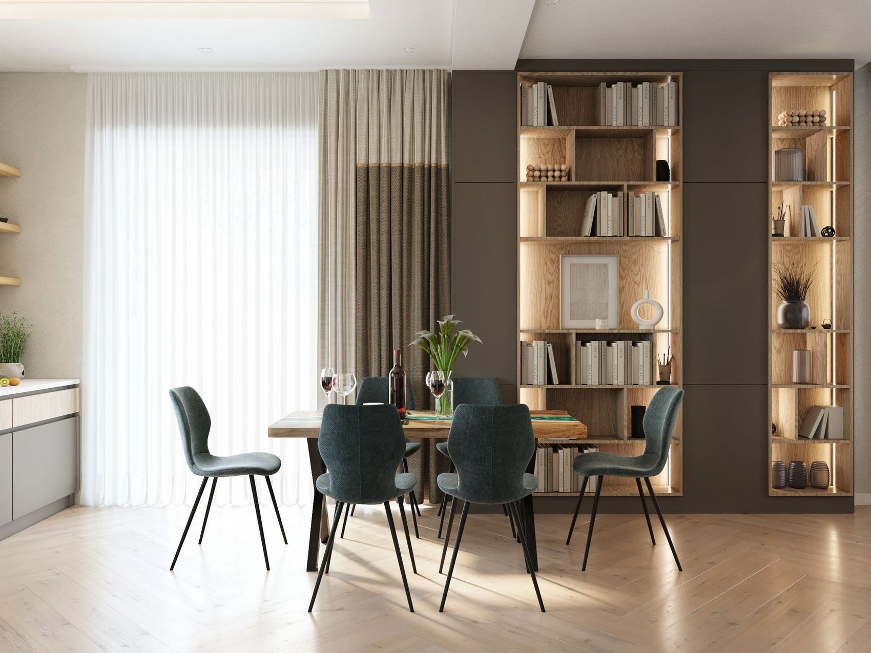 Wizualizacje tego domu zostały zlecone mi na etapie projektowym i wykonane zostały na podstawie wcześniej przygotowanych układów funkcjonalnych oraz listy materiałów i mebli. Zlecone pomieszczenia do wizualizacji obejmowały salon z kuchnią, sypialnię, gabinet oraz pokój dziecięcy. Dodatkowo, zamówione zostały usługi dodatkowe, takie jak panorama 360 stopni salonu z kuchnią oraz scenariusze oświetlenia dla salonu z kuchnią, sypialni, pokoju dziecięcego i gabinetu.